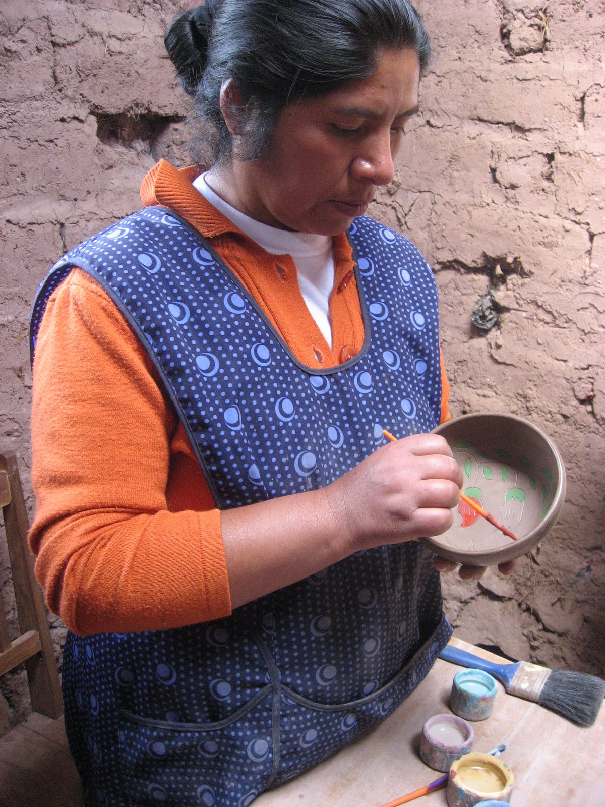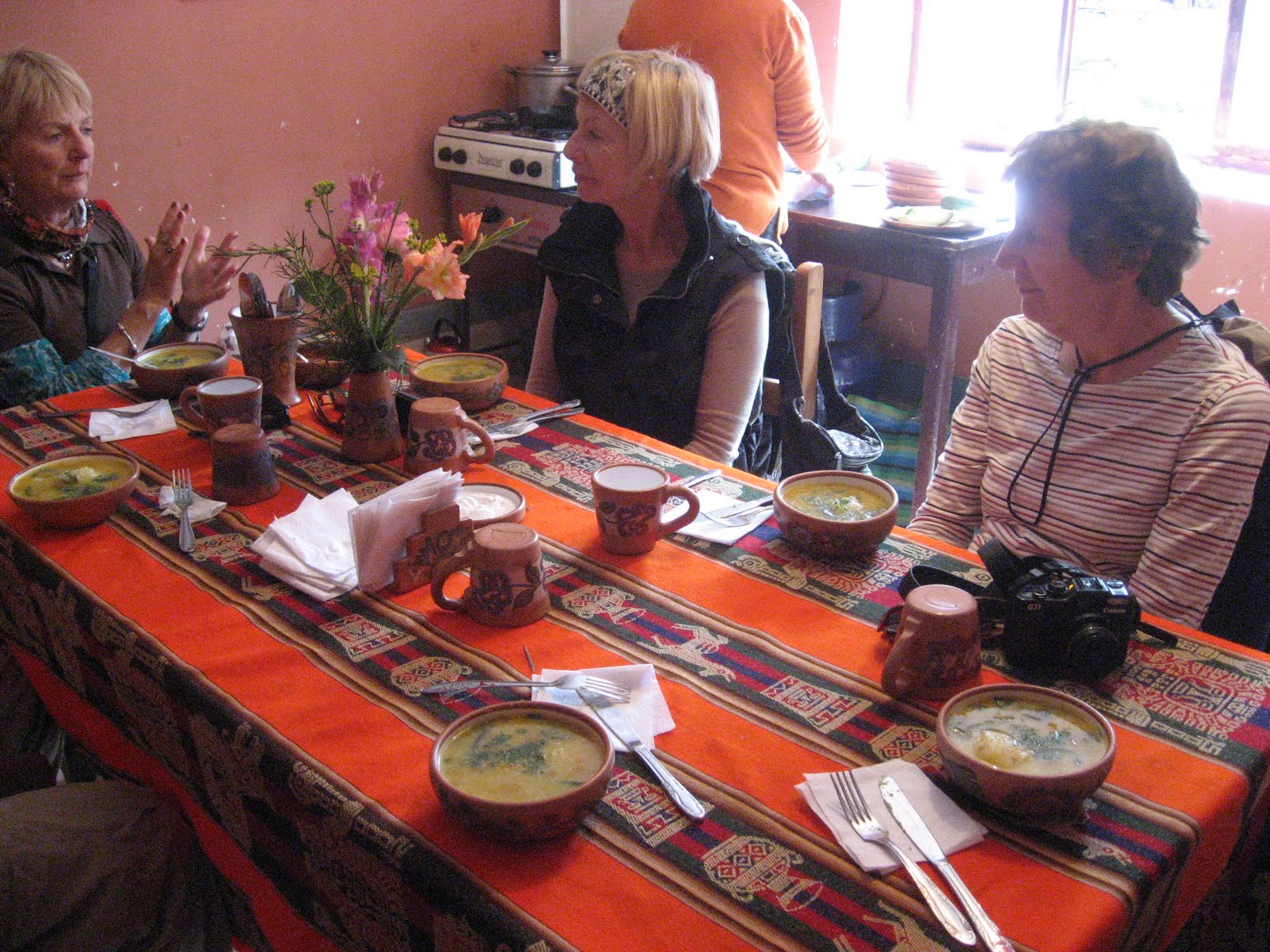 This morning we said goodbye to some of our group who are off to tackle the Inca Trail . We wish them luck on their 3 day hike to Machhu Picchu, where we will meet them at the Sun Gate. The remainder of the group visited Chichubamba community village 15 minutes walk from our hotel. Chichubamba combines two of Peru’s largest industries, agriculture and tourism. Many farmers in the rural zone confront obstacles while working to produce animal products and plants to meet the basic needs of themselves and their families. An organisation called ProPeru set up a program to help generate extra income for families by expanding their diversity of their products and services. The families have set up farmstay as well as educational workshops such as weaving, pottery, chocolate making and bee harvesting. This project is the first of its kind in the Sacred Valley and has been very successful in providing extra income to farmers. Today we visited 3 families – the first to see how chocolate is produced by one lady who has 2 young children. She learnt the craft from her mother and father who have a farm 2 days drive from her home. Her mother and father supply the chocolate pods to make the chocolate and sell to tourists and it was absolutely delicious. The second home we visited, the family are involved in making textiles which have played an important role in Andean society for hundreds of years. Textile systems developed in Peru over the millennia mostly remain unknown elsewhere because they are passed on by watching and practicing. We all had our turn at spinning the yarn and all failed miserably, so instead we purchased the finished product. The last family we visited we were presented with a delicious Andean meal of avocado (famous in Peru and some the size of a grapefruit) quinea and vegetable soup (quinea is a grain full of protein and used mainly in soups) and the last course was a vegetable dish with rice and potato followed by a delicious drink called chicha which is made from maize. A very healthy and filling feast. After lunch we were then presented with a demonstration of the art of make ceramics which has been present in Andean society for hundreds of years, again more purchases. The remainder of our afternoon was spent having a siesta.